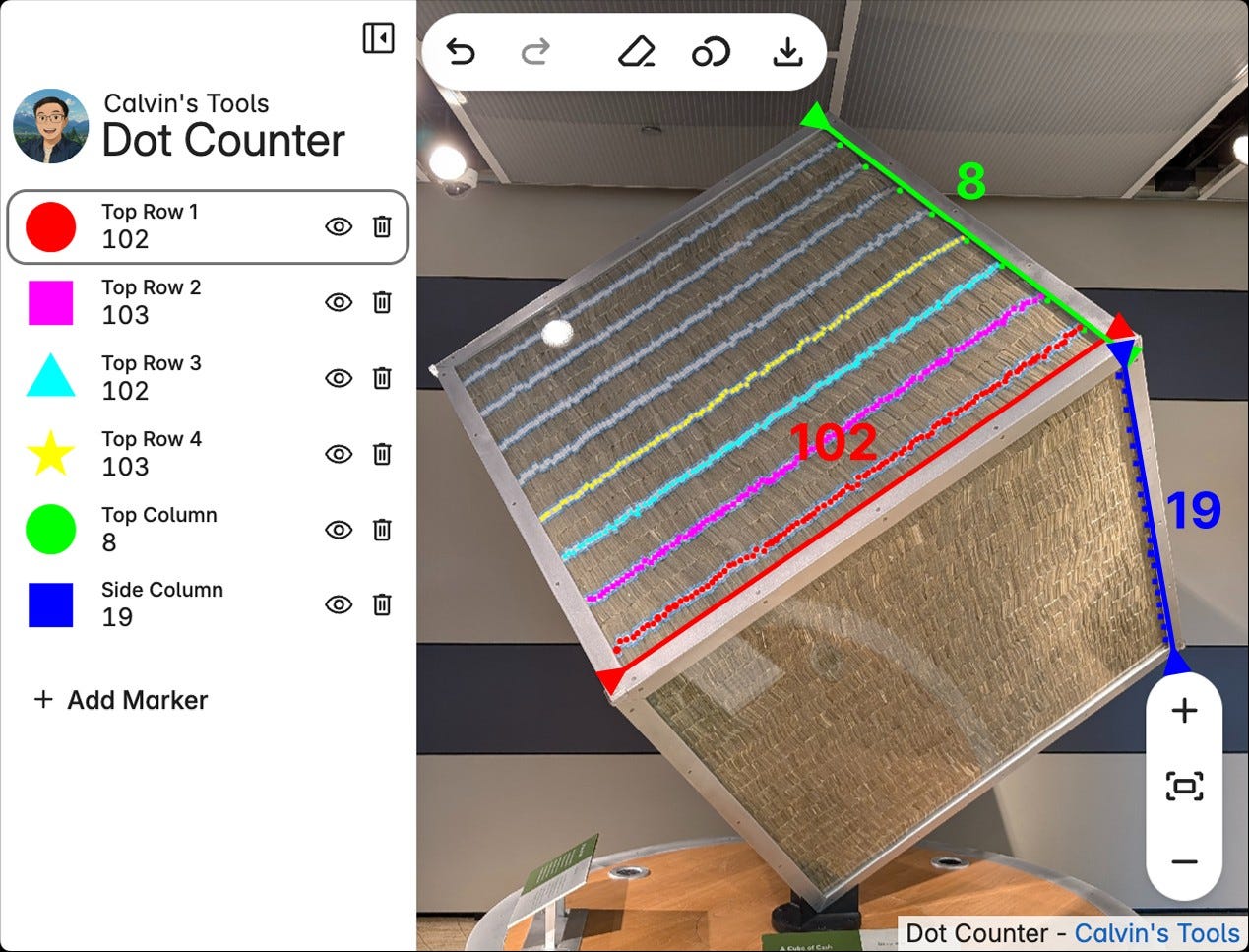 In this interesting blog post, Calvin Liang shared about his visit to the Federal Reserve Bank of Chicago's Money Museum, where he got suspicious about their display cube claiming to contain exactly $1 million in $1 bills. Unable to count the stacks accurately by eye, he built a web tool called Dot Counter that lets you click on images to count objects. Using his tool, he measured the cube and found it contains 102×8×19 bundles of bills, which equals $1,550,400 - meaning the Fed is off by $550,400 or about 50%. He speculates it might be hollow inside, they're planning for inflation, or it's just bad math, but nevertheless he created a cool tool to count stuff in photos.