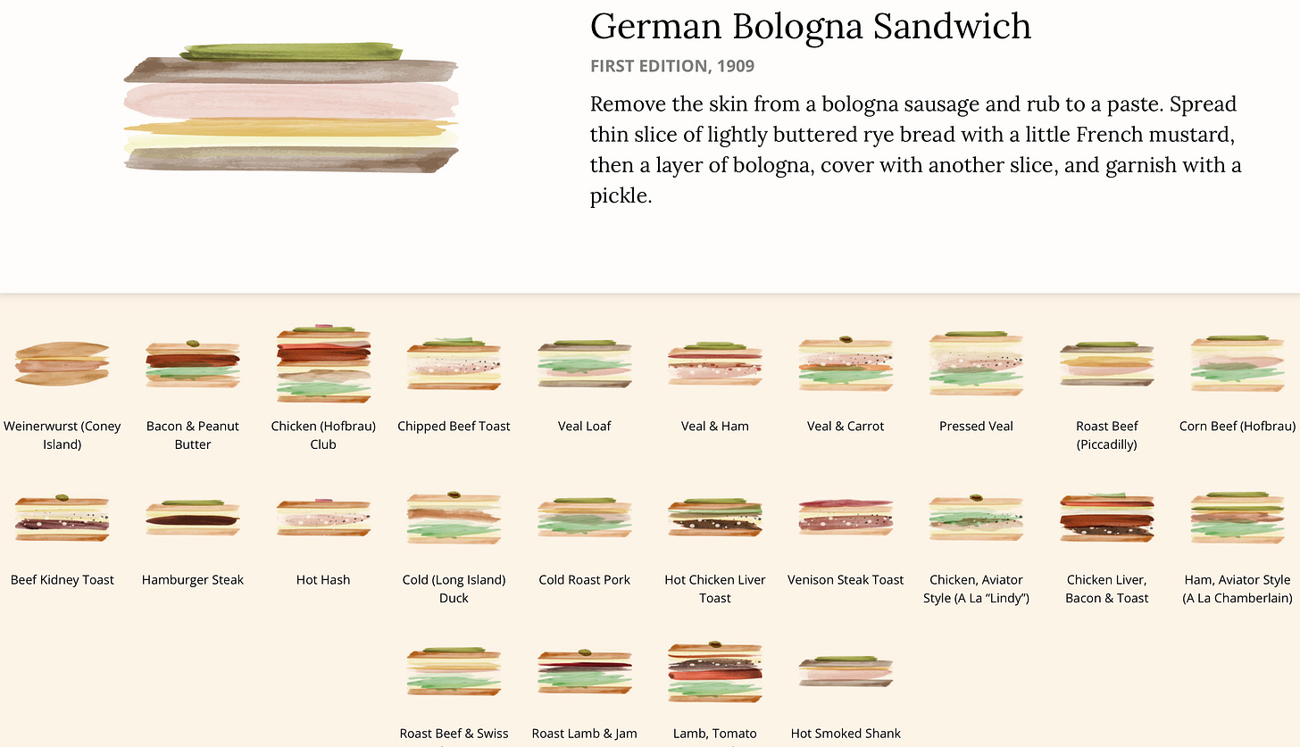 I came across this interesting project called ‘Painted Sandwiches’ by Nick Rougeux. He took Eva Green Fuller's vintage ‘Up-to-Date Sandwich Book’ from 1909 and 1927 (with 555 recipes total) and turned them into a clever visualisation using simple painted brushstrokes to represent each ingredient stacked in order. The colours are from actual ingredients, ingredients are stacked in order with brushstrokes with colours from photos, and garnishes appear as smaller brushstrokes. If you are an enthusiast, you can buy a poster as well!
